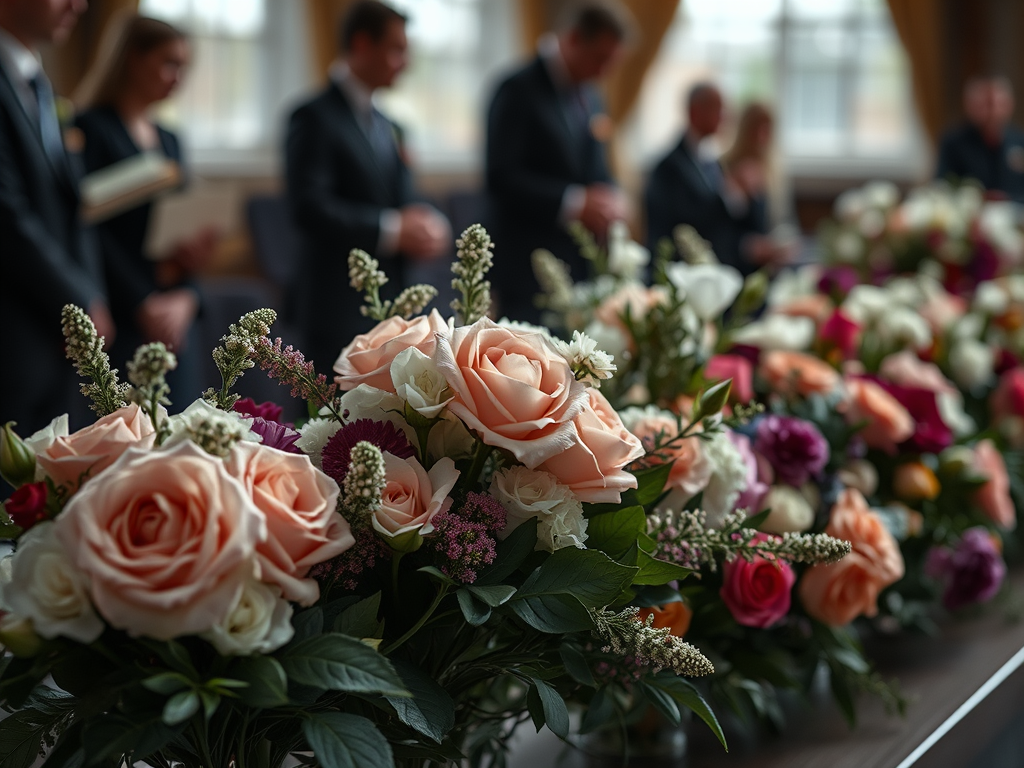 Blommor till begravningen beställs enklast genom en blomsteraffär. Handbuketter som läggs på kistan eller i graven som en sista hälsning under begravningen kan man också beställa via en blomsteraffären. Det går även bra att göra ett eget blomsterarrangemang eller att plocka egna handbuketter när säsongen tillåter.