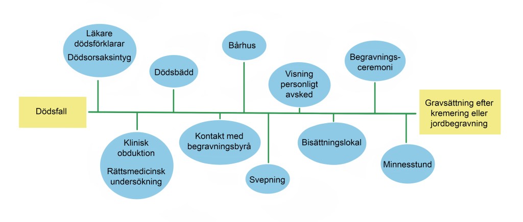 Det finns olika lagar och föreskrifter som styr vad som ska hända efter ett dödsfall. Läkaren fastställer dödsorsaken. Det är läkaren som undersöker kroppen och skriver ett så kallat dödsbevis och ett intyg om dödsorsaken. Läkaren skickar dödsbeviset till Skatteverket. Intyget om dödsorsak skickar läkaren till Socialstyrelsen.