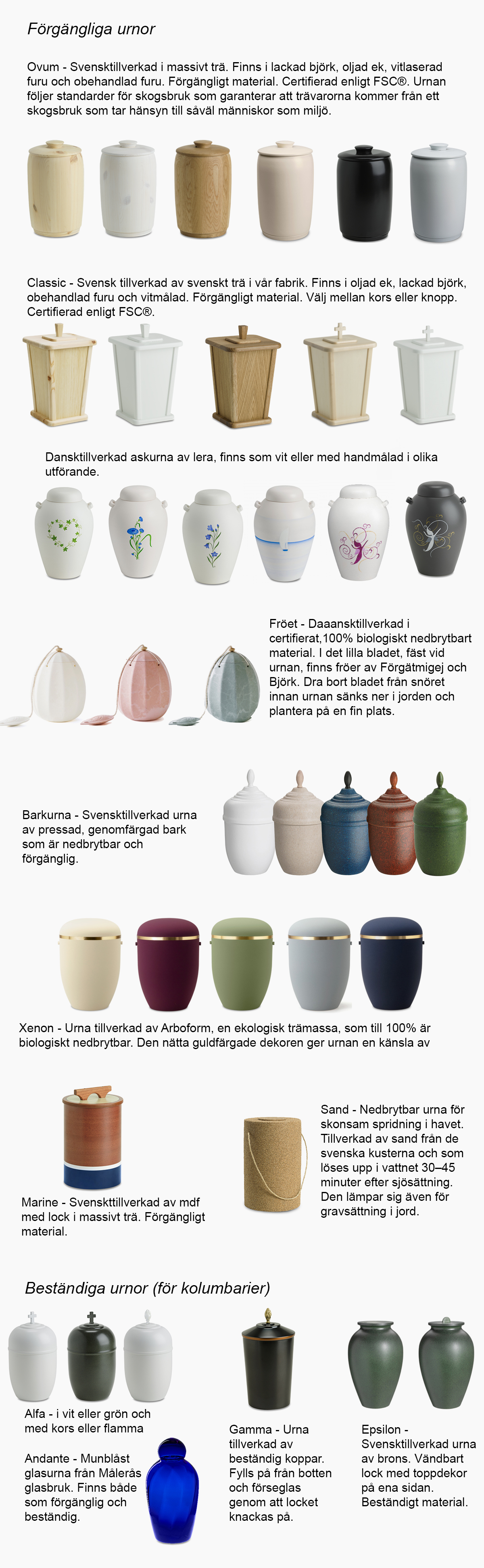 Urnor finns i olika material och färger. Det finns förgängliga urnor som löses upp med tiden och beständiga urnor. Vid gravsättning i jord på en kyrkogård krävs det att urnan är tillverkad av förgängligt material. En urna används när man väljer att kremera den avlidne och gravsätta i en traditionell grav, en askgrav eller ett kolumbarium, även kallad urnvägg eller urnmur. Om man inte önskar ha en begravningsceremoni med kista går det bra att kremera den avlidne först och sen arrangera en akt med urna. En urna kostar från 2000 kronor och uppåt.
